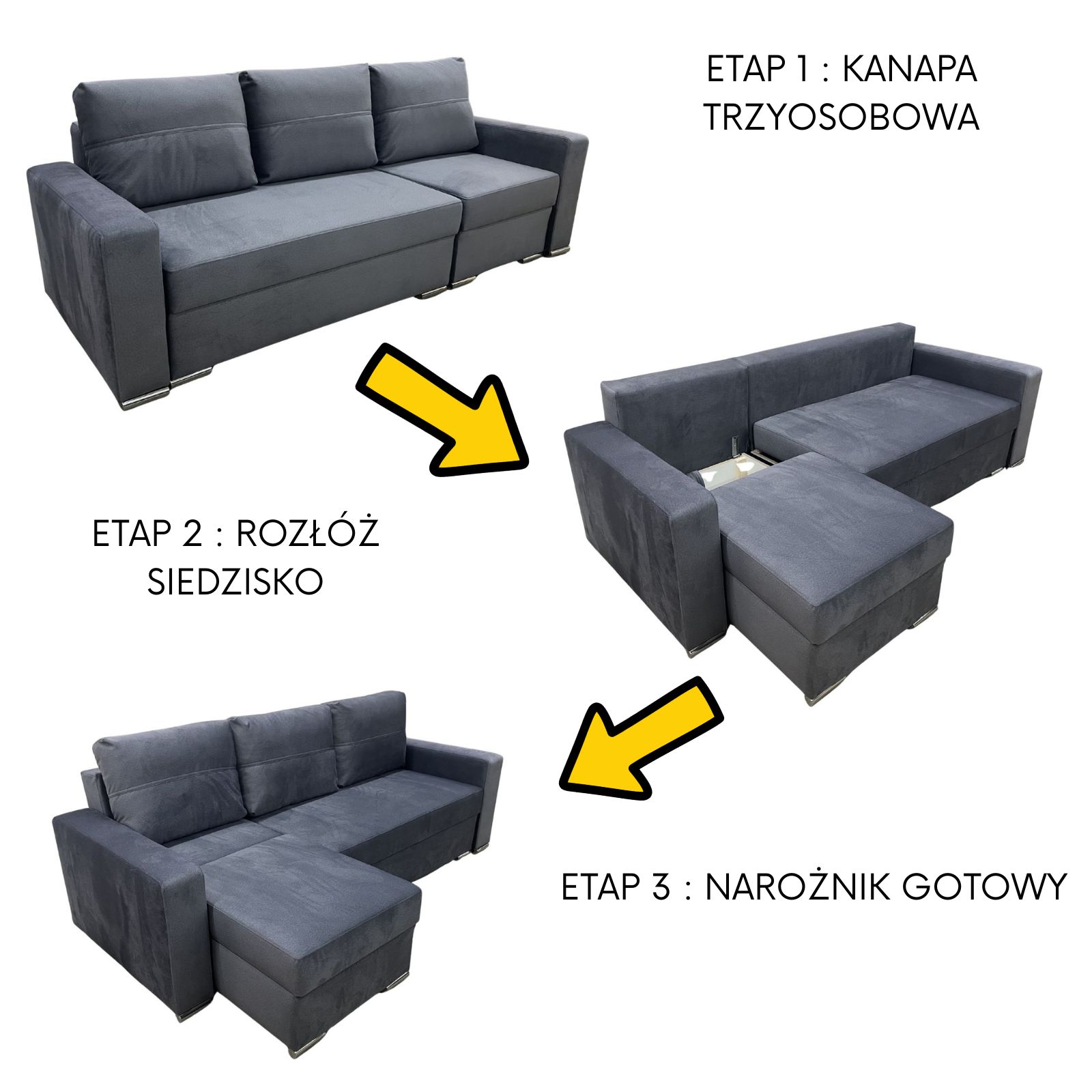 Największy atut? Ty decydujesz, czy chcesz mieć narożnik lewy, czy prawy. Nie musisz deklarować strony przy zakupie ani niczego skręcać na stałe. W każdej chwili możesz zamienić stronę szezlonga lub wrócić do formy klasycznej sofy. To wolność, której nie oferuje żaden standardowy narożnik.