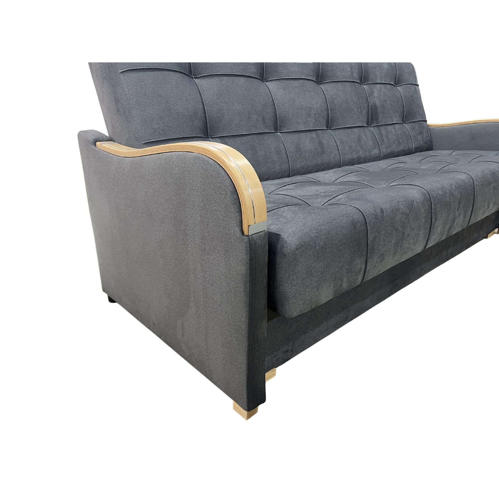 Jednak to, co naprawdę wyróżnia wersalkę Royal na tle innych modeli, to jej boczki. Zastosowano w nich eleganckie wstawki z naturalnego drewna, które płynną linią pokrywają górną część podłokietników. To detal, który nawiązuje do klasycznego meblarstwa gabinetowego. Drewno dodaje wersalce powagi i prestiżu, a jednocześnie jest niezwykle praktyczne – chroni tkaninę w miejscach najbardziej narażonych na zabrudzenia i zużycie, ułatwiając jednocześnie utrzymanie mebla w czystości.